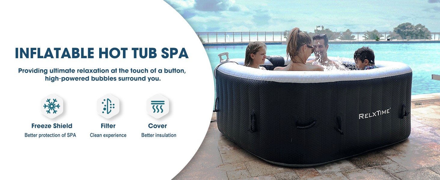 - HOT TUB WITH BUBBLE MASSAGE: The RELXTIME inflatable hot tub ideal for 2-3 person and heats up to a soothing 104 °F (40 °C) with 110 high-powered bubble jets. Bubbles come up from floor but it massages your lower and upper back, it not like jets but it feels good and relaxing.