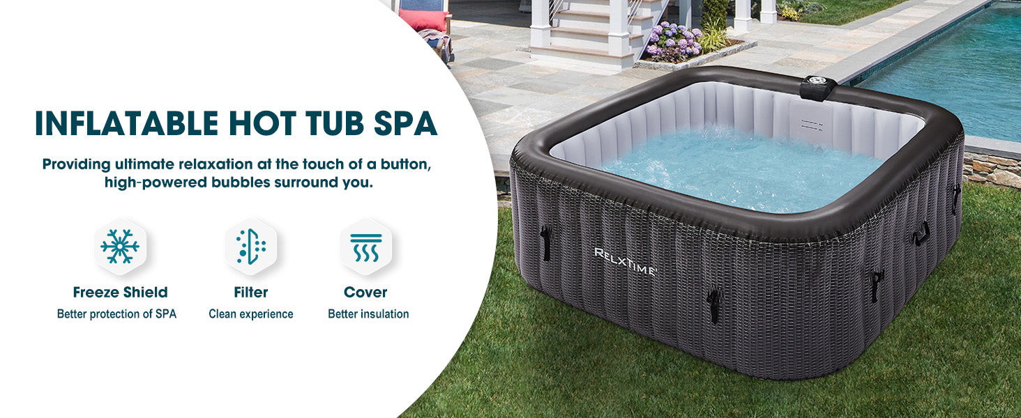 - 🌊HOT TUB WITH BUBBLE MASSAGE: The RELXTIME inflatable hot tub is made for up to 4-6 people and heats up to a soothing 104 °F (40 °C) with 130 surrounding powerful air bubbles, built-in integrated water filtration system to keep the water clean. Durable laminated PVC inflated walls for durability and comfort